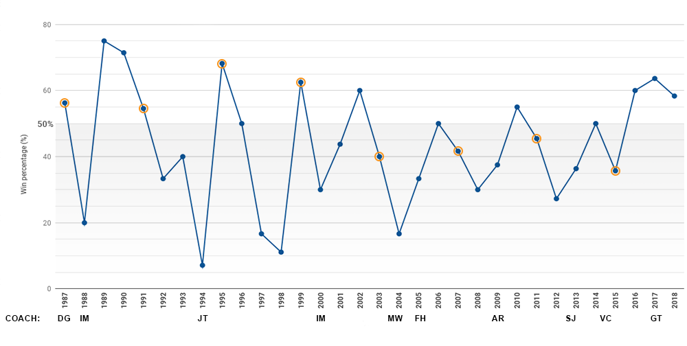 You can click to see a larger version (opens in new tab). Orange markers indicate Rugby World Cup years and coaches initials are in the year they took charge.This link should get you to the data with the query pre-defined if you want a closer look.